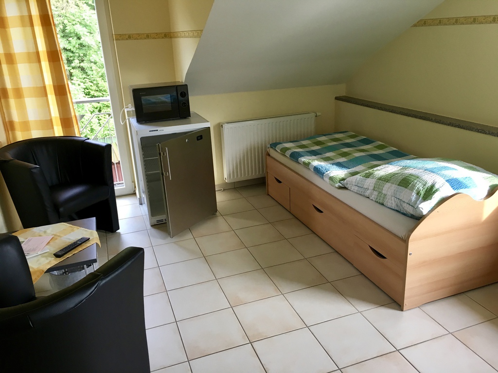 Unser Zimmer "Regent" ist 20qm groß und verfügt über ein Schlafzimmer mit Sitzgelegenheit sowie einem Bad mit Dusche. Eine Küche ist nicht vorhanden, allerdings ist das Zimmer mit Kühlschrank, Mikrowelle, Kaffemaschine, Wasserkocher, Geschirr, Sat-TV, Fön, Bettwäsche und Handtücher ausgestattet.