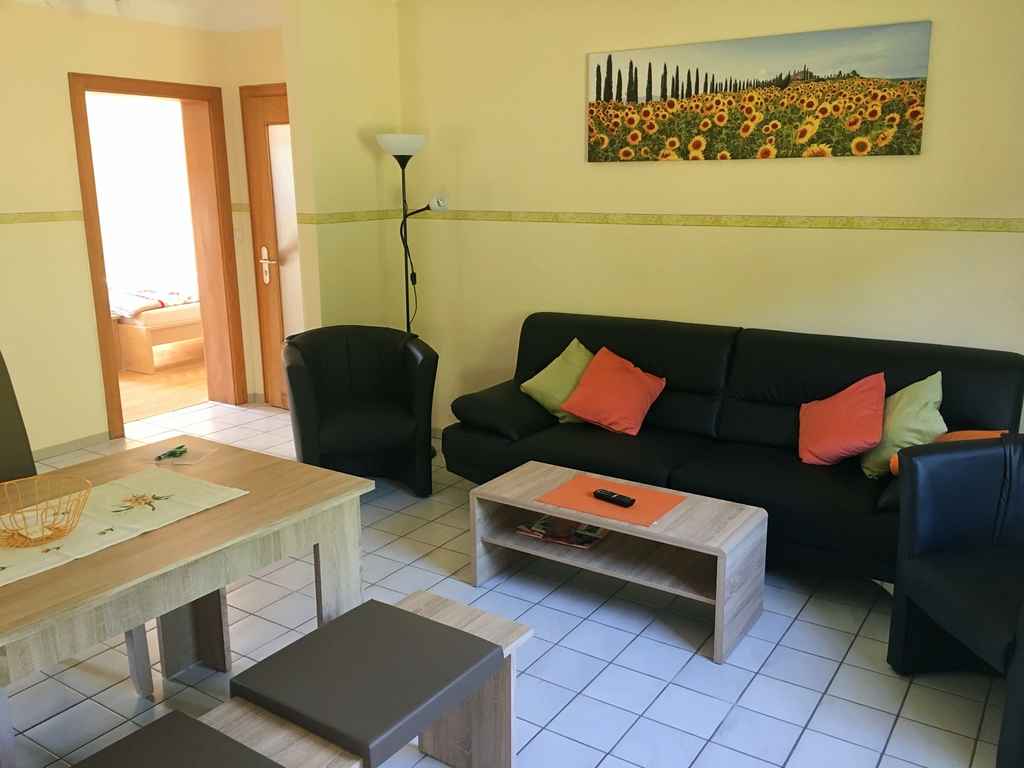 Unsere Ferienwohnung "Rivaner" ist 70qm groß und verfügt über zwei Schlafzimmer (Doppelbett bzw. zwei Einzelbetten), einem großen Wohn-/ Esszimmer, einer Küche sowie einem Bad.